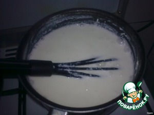 Кефир ставим на огонь. В воде разводим крахмал и вливаем в кефир, постоянно помешивая.