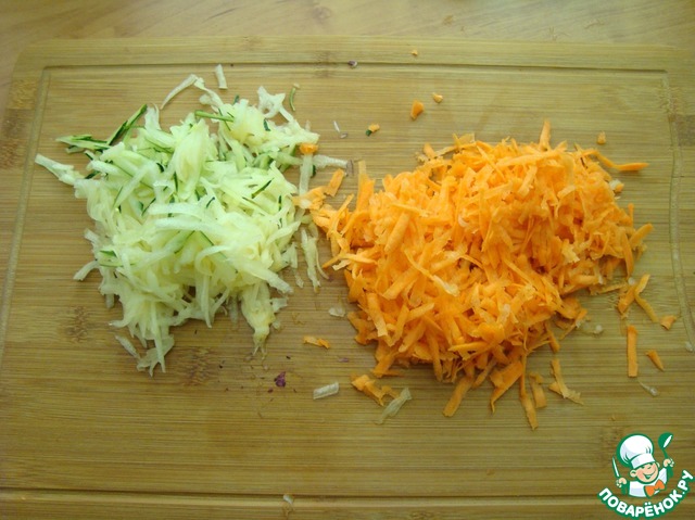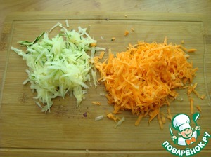 Кабачок и морковь натираем на тёрке и тоже отправляем в кастрюлю.