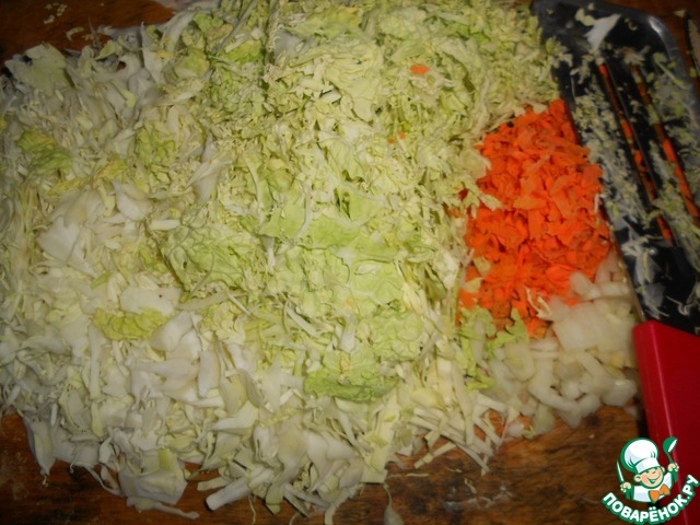 Капусту нашинкуйте, морковь натрите на мелкой терке, лук очистите и нарежьте. -