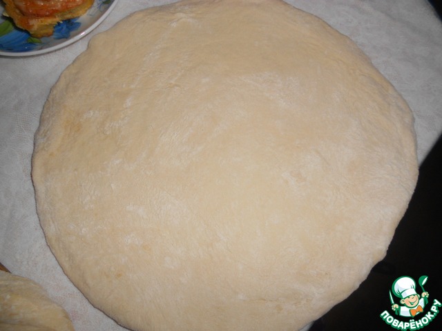 Тесто разделите на 2 части, большую часть раскатайте в круг и выложите в круглую форму для выпечки.