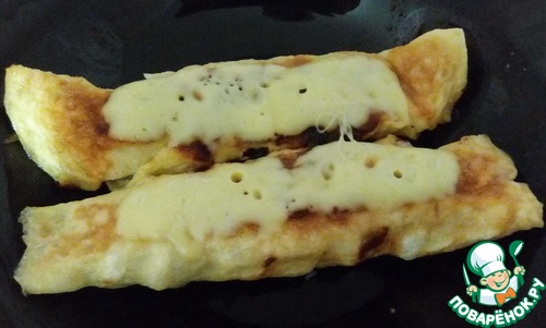 на разогретую сковородку наливаем чуть- чуть подсолнечного масла, выливаем яичную смесь и закрываем крышкой, пара минут - и омлетный блинчик готов
