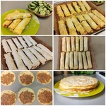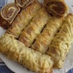 Скручиваем рулетики, выкладываем в форму для выпекания, предварительно застелив ее пергаментом. Если пергамента нет, смазать форму подсолнечным маслом, или можно выпекать в силиконовой, тогда без бумаги и без масла