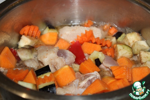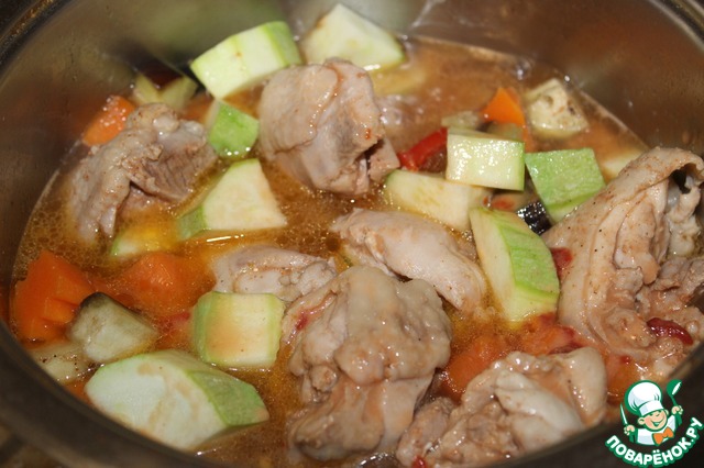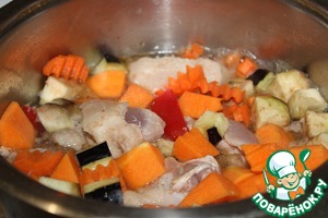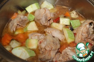 В кастрюлю влить воду или бульон, положить курицу, овощи (кроме грибов и кабачка).