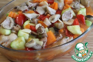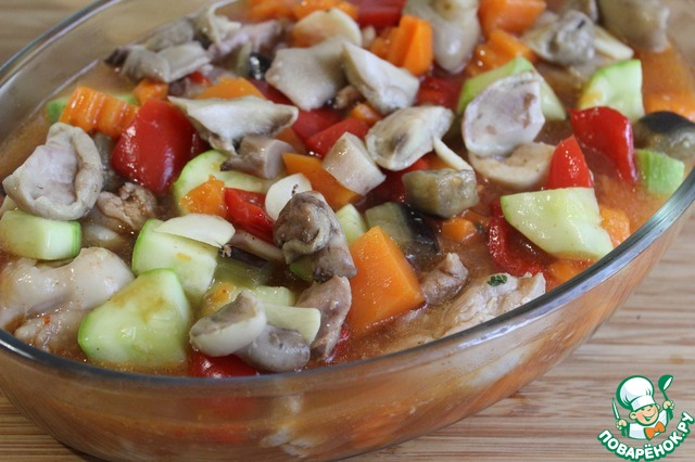 Вылить курицу с овощами в форму для запекания - если соуса слишком много - отлейте
