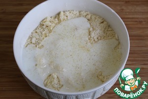 Муку смешать с солью, сахаром, разрыхлителем и содой.