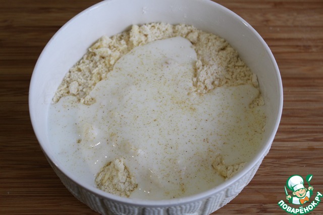 Влить кефир и замесить тесто - мягкое и поддатливое - если нужно, то добавить муку. -