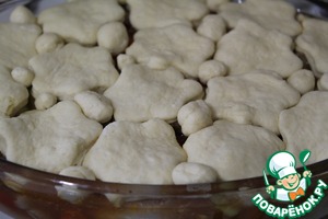 Выложить на курицу с овощами отварные грибы, а сверху прикрыть вырезанным тестом. -