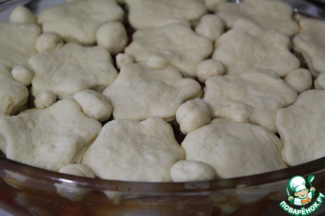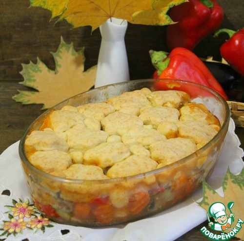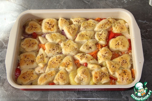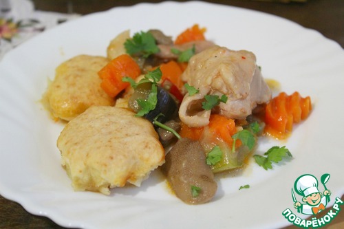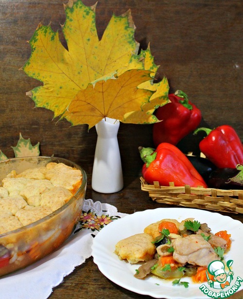 Все в одном - так можно сказать про это блюдо. Пряная курица, ароматные овощи, и все это покрыто нежными булочками - это очень вкусно! Чтобы сделать булочки, потребуются считанные минуты. Пробуем? И гостям подать не стыдно!