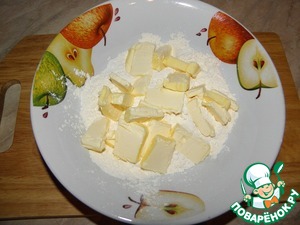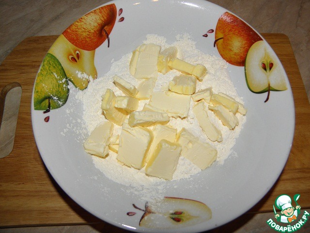Высыпать в чашку 150гр муки и добавить холодное порезанное масло (можно мелко ножом порубить) Быстро растереть его с мукой