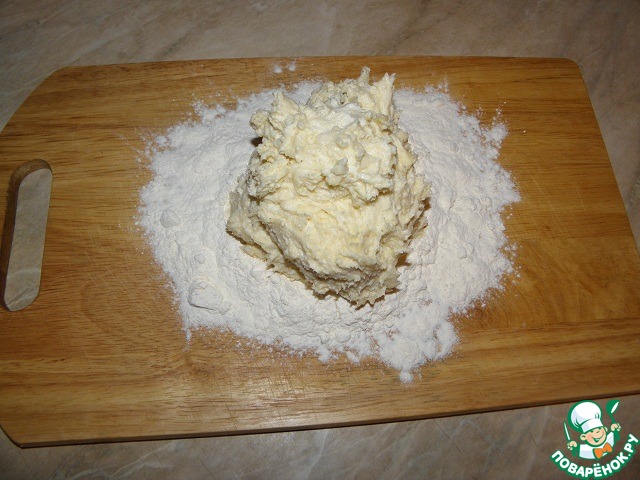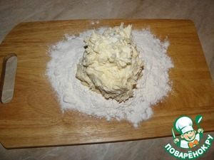 Теперь нам понадобится еще мука, примерно грамм 30-40. Высыпаем ее на стол, выкладываем на нее творожное тесто и быстро замешиваем до гладкого мягкого состояния