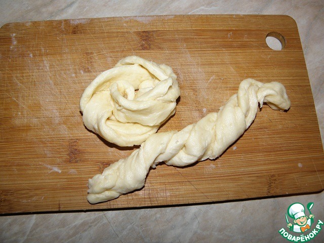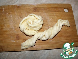 Берем две полоски и скручиваем их слегка в веревочку-косичку. Далее скрутим нашу косичку в кольцо и концы завернем под низ, серединку кранца чуть приплюснуть (чтоб не вытекла жидкость от фруктов при выпечке)