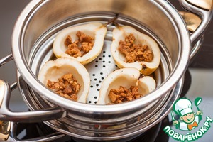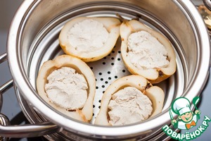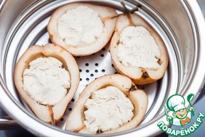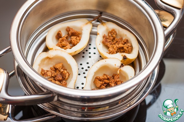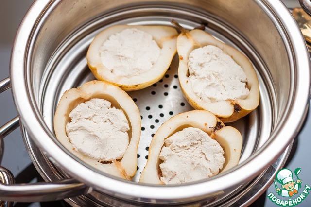 В груши покрошить немного сухого миндального печенья, оно впитает влагу из творога и груш и добавит миндальную нотку к этому десерту. Пароварку Zepter установить на кастрюлю с любым готовящимся блюдом (я готовила шоколадно-творожную запеканку http://www.povarenok .ru/recipes/show/132 876/ - уберите пробелы, чтобы пройти по ссылке), запахи в Zepter не смешиваются, поэтому можно совместить приготовление десерта с любым другим блюдом.