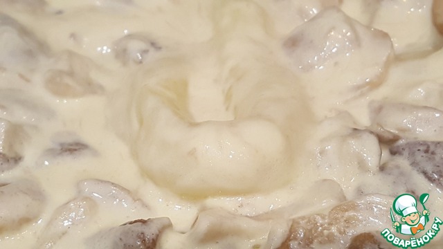 Добавить сметану и потушить пару минут, постоянно помешивая и выпаривая лишнюю жидкость.