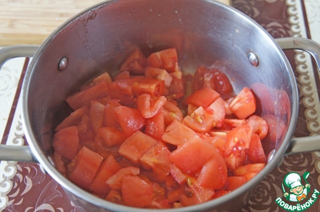 Добавить бульон и соль. Тушить на малом огне под крышкой, пока помидоры не превратятся в пюре.
