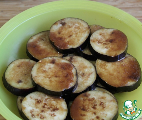 Баклажаны обмакнуть в маринад, уложить друг на друга и оставить мариноваться на час. -