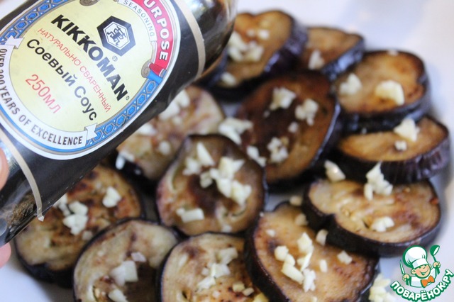 Баклажаны слегка обсушить и обжарить с двух сторон на растительном масле, выложить на блюдо в один слой и пересыпать чесноком.