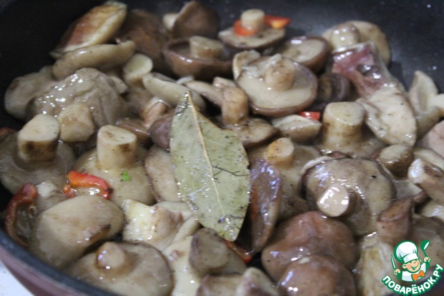 На растительном масле обжарить грибы с лавровым листом, посыпать грибным порошком, посолить и поперчить по вкусу, добавить по вкусу колечки чили.