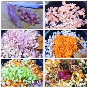 Режем кубиком и отправляем обжариваться на масле в сковородку.
