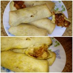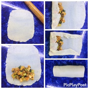 Заворачиваем край на начинку, затем также боковые края подгибаем и скручиваем трубочку (на фото виден процесс). -