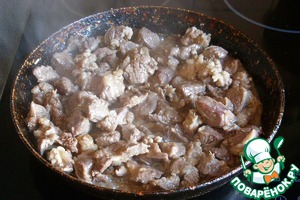 Мясо режем довольно крупными кусками, посыпаем солью и перцем, обваливаем в муке. Стряхиваем лишнюю муку и обжариваем мясо на сковороде на растительном масле на умеренно сильном огне. Первые три минуты мясо не трогаем. Когда снизу появится лёгкая золотистой корочка, начинаем мешать мясо до тех пор, пока мясо не обжарится со всех сторон, но не пересохнет. Перекладываем мясо в кастрюлю.