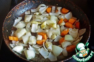 На сковороду с остатками жира выкладываем нарезанные крупно лук и морковь. Обжариваем несколько минут овощи и перекладываем их к мясу.