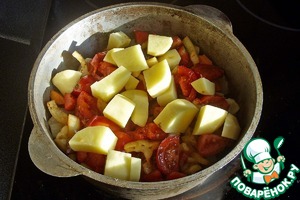 Добавляем резанный перец и помидоры. Сверху выкладываем картофель. После этого накрываем кастрюлю крышкой и отправляем её в духовку. Я томил рагу при температуре 85 град. Ц в течение шести часов. Никакого моего участия и присутствия блюдо не требовало.