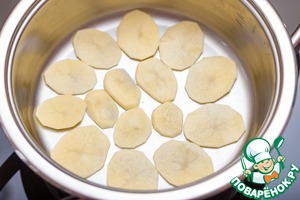 Картофель нарезаем очень тонко, прозрачными ломтиками. Поскольку картофель - это единственный продукт, который может пристать ко дну кастрюли Zepter, на дно холодной кастрюли капаем буквально 2 капли оливкового масла и смазываем всю поверхность. Сверху укладываем картофель.