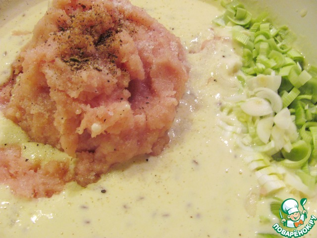 Нарезаем полукольцами лук-порей и вместе с фаршем отправляем его к тесту. Добавляем смесь перцев и соль.
