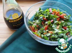 Зелень можно использовать любую: петрушку, кинзу, мяту, базилик. Но лучше, чтобы был именно микс из трав, так вкуснее. Итак, зелень рубим не очень мелко, чили режем тонкими полосками. Его количество полностью зависит от Ваших предпочтений. Смешиваем в миске масло, мёд, соевый соус, лимонный сок, чили и зелень.