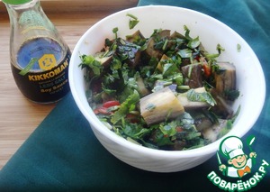 Готовые баклажаны слегка остужаем, режем довольно крупными ломтиками и сразу же заправляем маринадом. Всё! Блюдо готово!