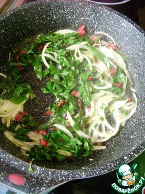• Лук нарезать вдоль луковицы тонко, ботву нашинковать так же соломкой. Разогреть масло и обжарить лук до легкой позолоты, добавить ботву и слегка спассеровать.