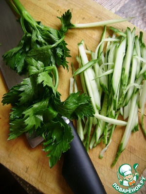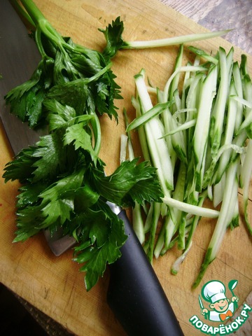 • Огурец нарезать вручную соломкой, чтобы он не выделял лишний сок. Зелень сельдерея измельчить.