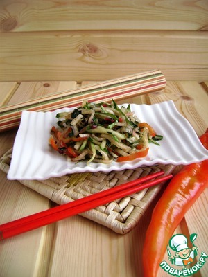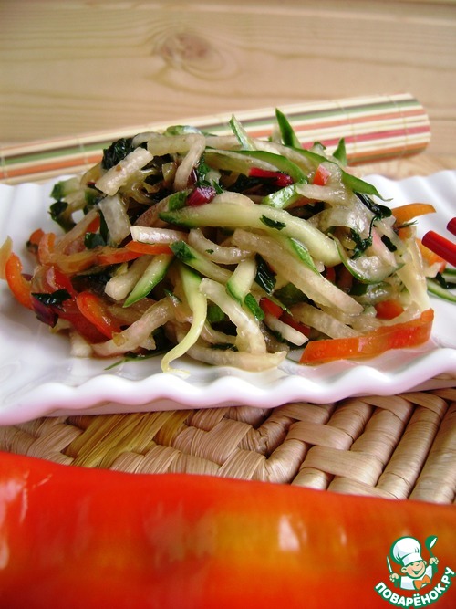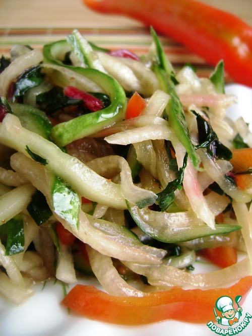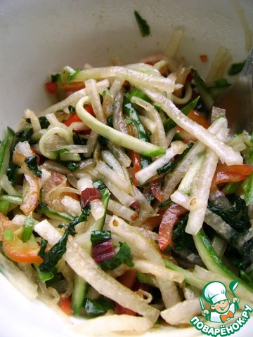 • Нарезать тонкой соломкой дайкон и перец, можно натереть овощи на терке для корейских салатов. Выложить в миску.