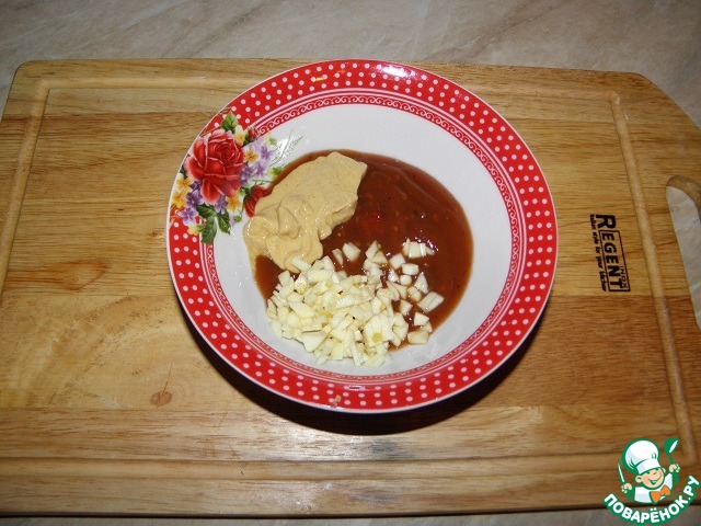 Для соуса: берем аджику, горчицу и чеснок, кол-во продуктов по вкусу, чеснок можно нарезать мелко, можно пластинками, можно через чесночницу, как любите. Специи можно добавить в маринад, а можно отдельно ими натереть рульку.
