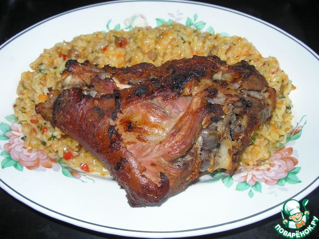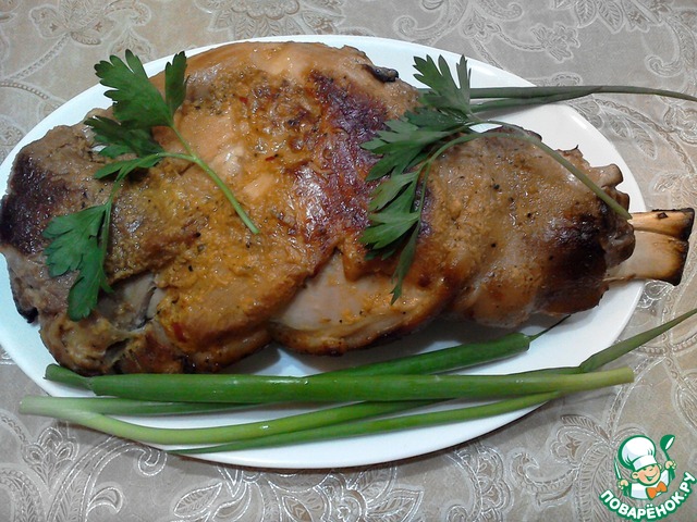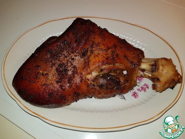 Кладем в рукав, завязываем и отправляем в духовку на 2-2,5 часа (зависит от веса ноги) при температуре 180%. За некоторое время до конца приготовления, когда уже рулька будет мягкой и мясо чуть должно отходить от кости, дырявим пакет и запекаем до золотистости.