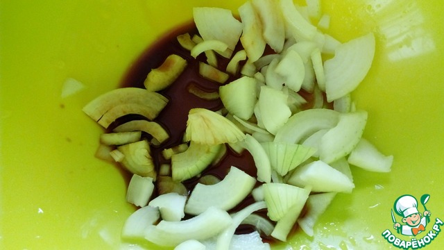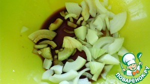 Делаем маринад для мяса. Одну луковицу нашинковать, добавить лимонный сок и 2 столовые ложки соевого соуса.