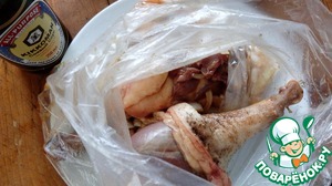 Искупать гусиные ножки в маринаде, выложить все в пакет, завязать и оставить мариноваться в холодильнике не менее, чем на час. На ночь было бы вообще здорово.