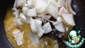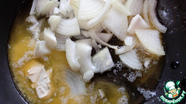 Для соуса обжарить вторую порезанную луковицу в смеси сливочного и растительного масла.