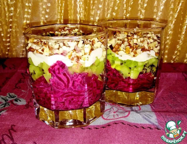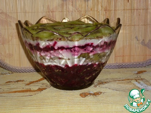 Слоеный салат от моей мамы. Она назвала его "Экзотик", наверное, из-за киви, который когда-то был не частым гостем на наших столах. Нежный, вкусный, с приятной кислинкой. Еще хорош тем, что ингредиенты используются в свободном соотношении и дозировке, исходя из личных вкусовых пристрастий и предпочтений!