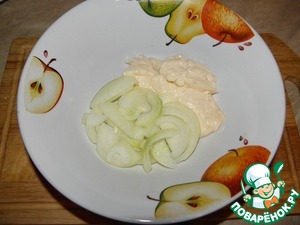 Лук произвольно нарезать, добавить майонез