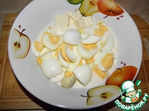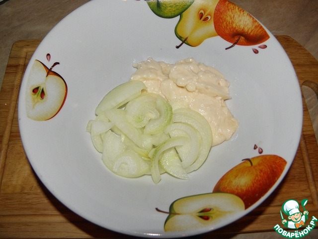 Яйца отварить, к майонезно-луковой массе добавить яйца и плавленый сыр