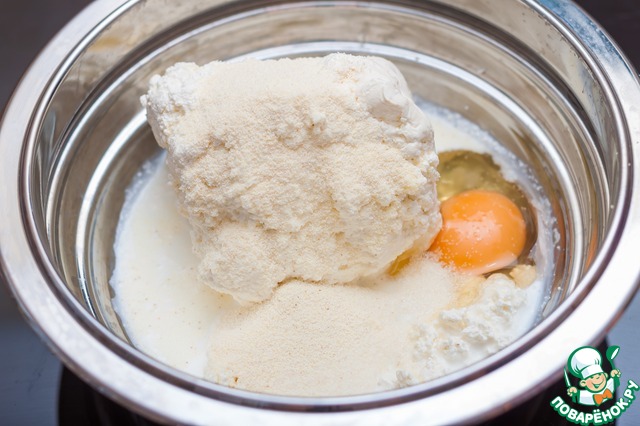 Творог соединить в миске с молоком, яйцом и манкой. Взбить блендером.