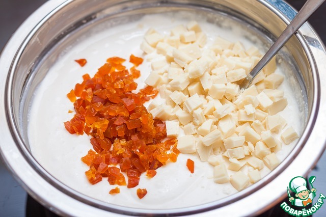 Добавить курагу и белый шоколад, нарезанные небольшими кусочками, перемешать. Шоколад у меня был ванильный, поэтому ванильную эссенцию не добавляла.
