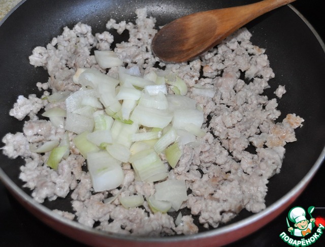 Сверху кладём обжаренный с луком фарш.