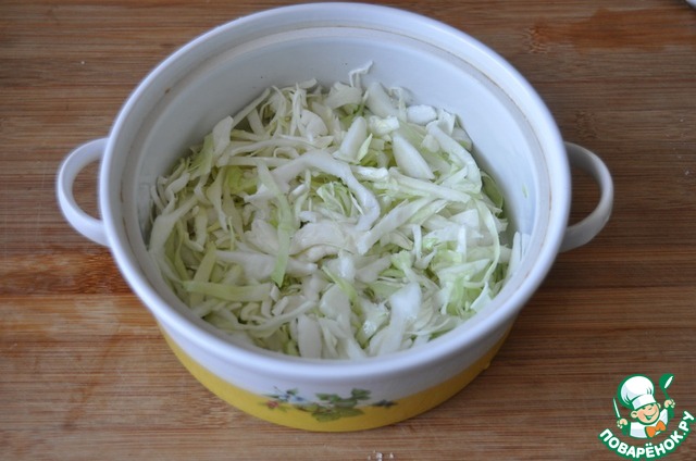 Капусту присыпаем солью, слегка перетираем и кладём на дно горшочка (кастрюли). -