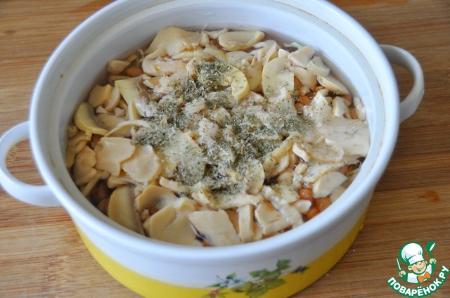 Заливаем всё бульоном, солим, посыпаем сухими травами (у меня петрушка).