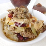 Следующим слоем кладём консервированную фасоль. В моём случае в остром томатном соусе. По желанию добавляем ещё томатный соус.