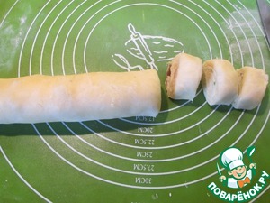 Начиная с короткой стороны скатайте тесто в плотный рулет. Острым ножом разрежьте рулет на части толщиной 2-2,5 см.