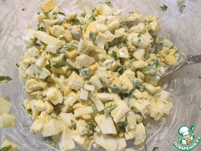 Яйца сварить вкрутую, остудить, очистить, порубить не очень крупно. Петрушку мелко порезать, смешать с яйцами, заправить майонезом, посолить и поперчить.