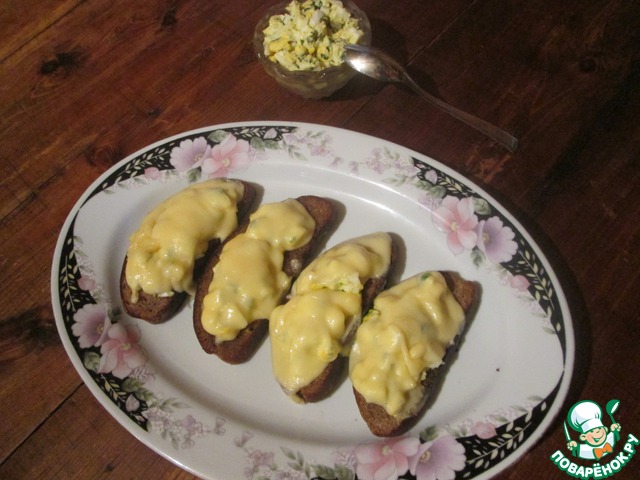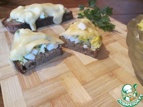 Разогреть гриль в духовке. Поджарить куски хлеба на сухой сковороде или в тостере, разложить по ним яичный салат. Сверху уложить кусочки сыра, стараясь закрыть ими салат, и поставить сэндвичи под гриль, чтобы сыр растаял.